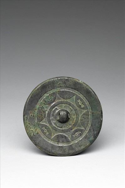 圓鏡,橋鈕,方花紋鈕座。鈕座間有銘四字,外飾連弧紋。