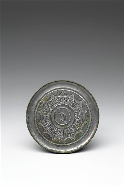 圓鏡,圓鈕座,鈕殘。銘文帶十四字,外飾連弧紋。