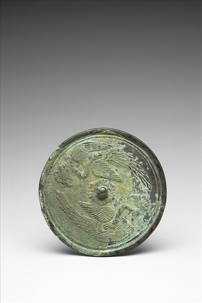 圓鏡,圓鈕、花瓣形鈕座。鏡背飾鳳紋。