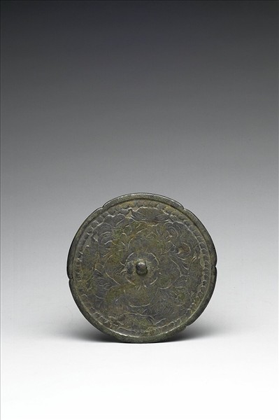 圓鏡,作六瓣花形、圓鈕、花瓣形鈕座。鏡背飾花卉與蝶。