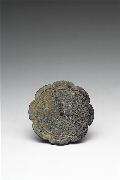 圓鏡,作八瓣花形、橋鈕、圓鈕座。鏡背飾花卉紋。鏡沿有銘十字。