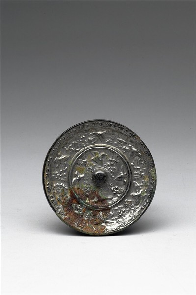圓鏡,圓鈕、圓鈕座。內區飾花卉與飛鳥紋,外區飾花卉、飛鳥紋與卷草紋。
