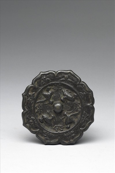 圓鏡,作八尖瓣菱花形、圓鈕。鏡背飾鳧雁與花卉。