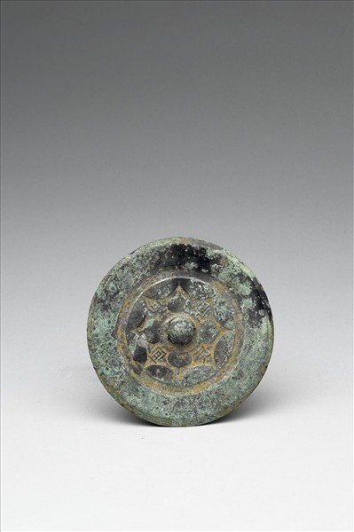 圓鏡,圓鈕、四葉紋鈕座。鈕座間有銘四字,外飾連弧紋。