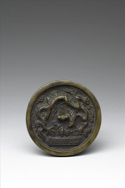 圓鏡,扁鈕。鏡背飾雲龍紋、一印記。