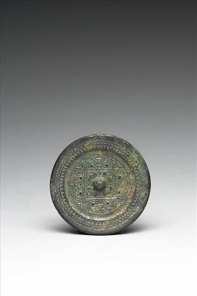 圓鏡,圓鈕、四葉紋鈕座。內區飾乳丁紋、博局紋與四靈紋,外區飾連山紋。