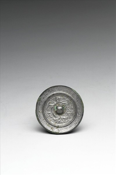 圓鏡,圓鈕、圓鈕座。內區飾龍紋,外區銘文帶三十二字。