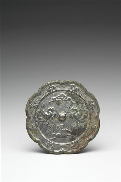 圓鏡,作八瓣花形、圓鈕。內區飾狻猊與雲紋,外區飾花卉。