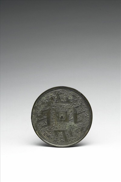 圓形鏡,背作帶紋及弦紋邊,飾以四山紋,填以花葉雲紋地,中作方形,直紋鼻。