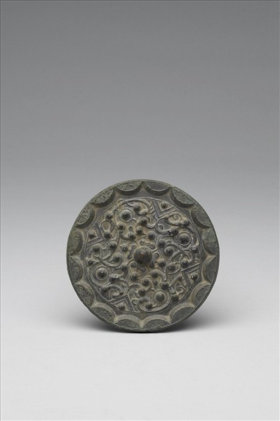 圓鏡,圓鈕、四葉紋鈕座。內區飾交織紋與博局紋,外區飾連弧紋。