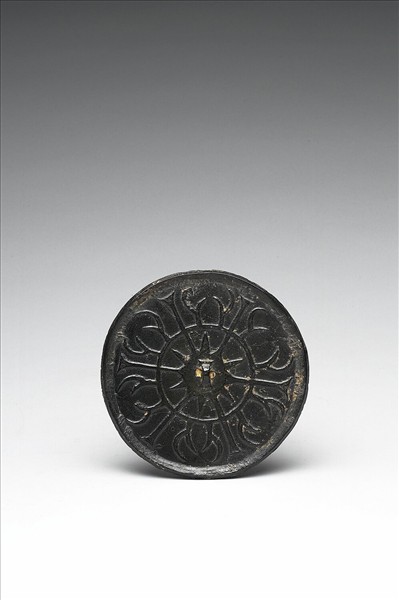 圓鏡,橋鈕、日光形鈕座。外區飾鹿角紋。