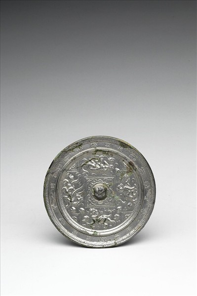 圓鏡,圓鈕、四葉紋鈕座。內區飾四獸紋與規矩紋,外區銘文帶二十字。