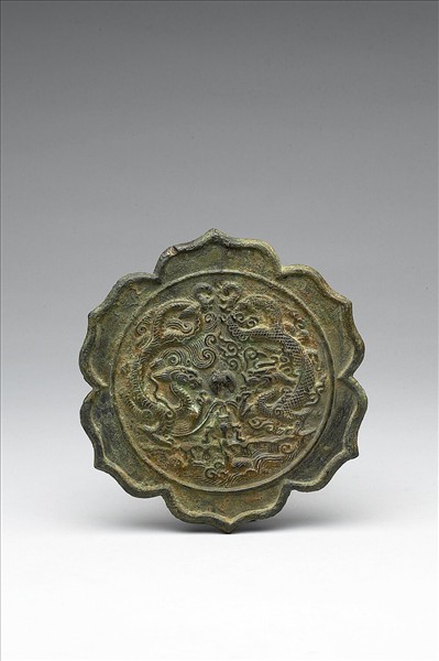 圓鏡,作八尖瓣菱花形,鈕有傷缺。鏡背飾龍紋與壽山福海。