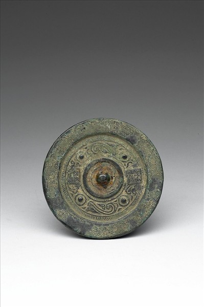 圓鏡,橋鈕、圓鈕座。鏡背飾乳丁紋與雲紋。有銘二處各四字。