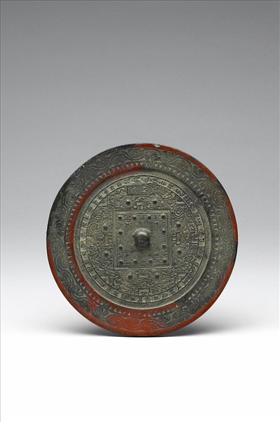 圓鏡,圓鈕。內區飾乳丁紋、規矩紋與四靈紋,銘文帶模糊,外區飾連山紋與卷草紋。
