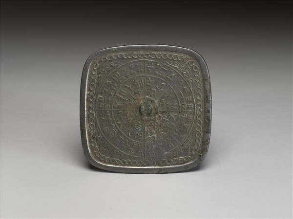 鏡作方形圓轉角,鏡鈕已殘,八角形鈕座,座外有同心圓兩圈,由鈕座向外射出之八道直線將兩圓等分為八格,內圈分別有「吉」、「凶」、及、「天官」、 「天陰」、「天富」、「天盜」、「門天」、「天賊」、「天財」、「天陽」等 字,外圈則羅列著一個月中的每一日,四角飾以雲頭紋,最外環以鎮鍊紋,素窄鏡邊略高於內區,由鏡背上的文字及內圓外方的紋飾看來,應是模仿占星卜算的式盤來的。
