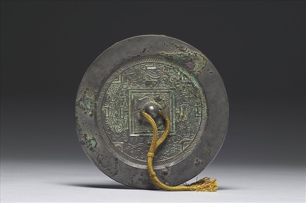 圓鏡,半球鈕、四瓣葉形鈕座。鏡背飾大方格與博局紋,其中夾有四獸紋。