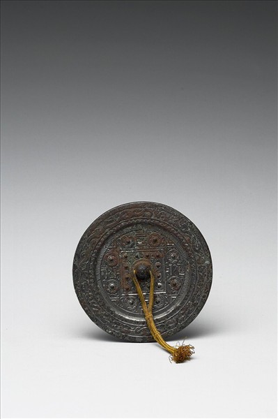 圓鏡,半球鈕、圓鈕座。鏡背飾大方格與博局紋,夾有卷草與乳丁紋,鏡緣有三角形紋與變形雲紋。