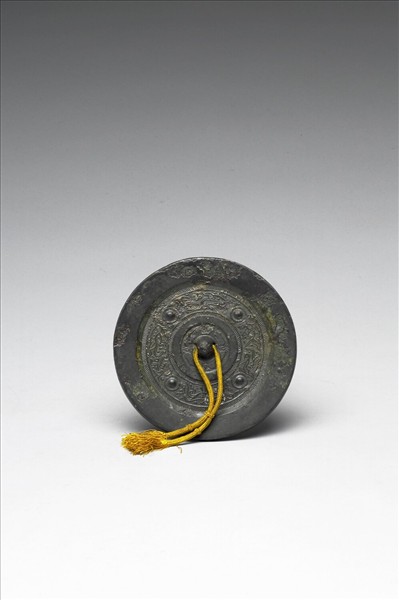 圓鏡,半球鈕、連珠花瓣形鈕座。鏡背是四組乳丁、神人禽獸畫像。