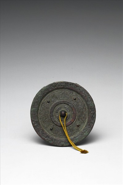 圓鏡,半球鈕、連珠花瓣形鈕座。鏡背飾四組乳丁與細線簡化獸紋。