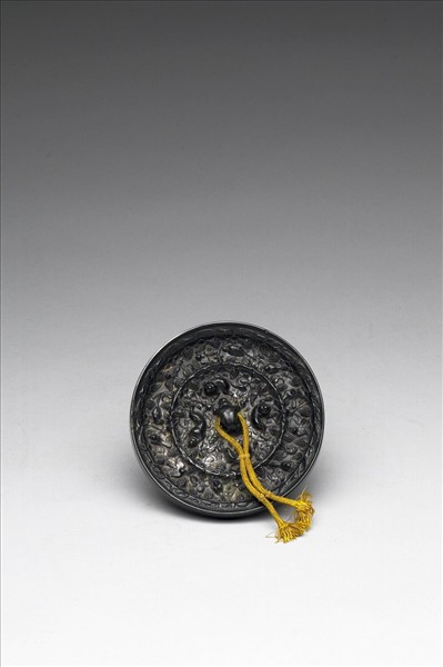 圓鏡,獸形鈕。鈕外飾四隻瑞獸,鏡背中央有凸棱,外圈飾鳥紋,展翅與靜止間隔排列,葡萄與藤蔓夾雜其中,鏡緣則為一周卷草紋。