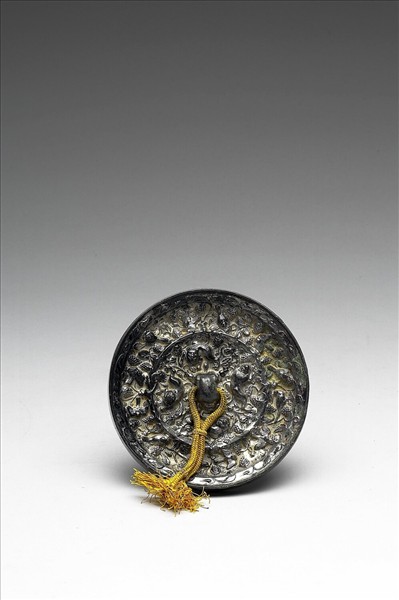 圓鏡,獸形鈕。鈕外飾四隻瑞獸,鏡背中央有凸棱,外圈飾鳥紋,展翅與靜止間隔排列,葡萄與藤蔓夾雜其中,藤蔓卷草尾端延伸至鏡緣處。