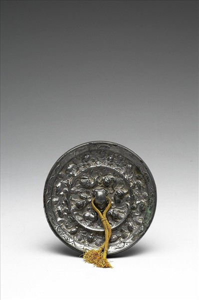 圓鏡,獸形鈕。鈕外飾六隻瑞獸,鏡背中央有凸棱,外圈飾鳥紋,葡萄與藤蔓夾雜其中,藤蔓卷草尾端延伸至鏡緣處。