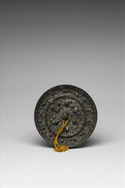 圓鏡,獸形鈕。鈕外飾四隻瑞獸,鏡背中央有凸棱,外圈飾鳥紋,展翅與靜止間隔排列,葡萄與藤蔓夾雜其中,鏡緣則為一周花朵紋。