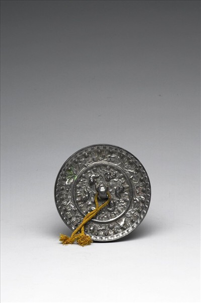圓形鏡,伏獸形鈕。鏡背以高起的連珠弦紋分為內外兩區。內區葡萄藤蔓上有六隻獅子,外區則為蜻蜓、小鳥穿梭於葡萄藤蔓間。鏡緣飾雲朵紋。