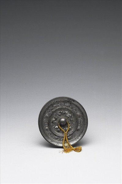 圓鏡,圓鈕、圓形座。鈕外飾五隻瑞獸,鏡背中央有凸棱,外圈飾葡萄與卷枝藤蔓,鏡緣則有卷草紋。