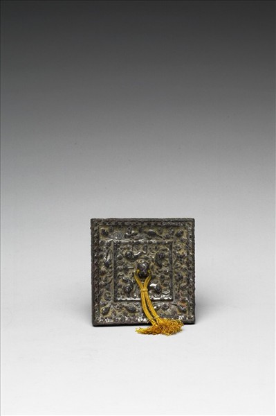 方鏡,獸形鈕。鈕外飾四隻瑞獸,鏡背中央有凸棱,外圈飾鳥紋,葡萄與藤蔓夾雜其中,鏡緣有一周連珠紋。