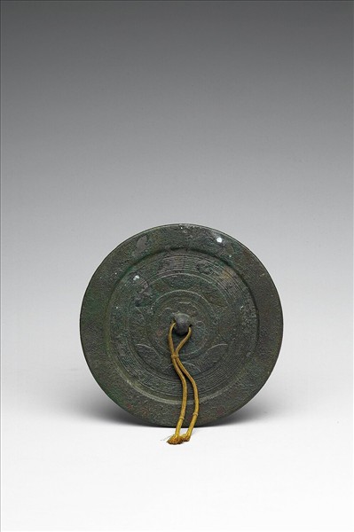 圓鏡,半球鈕、四葉形鈕座。鏡背飾連弧紋及細線陽文組成的圓渦紋與線紋。