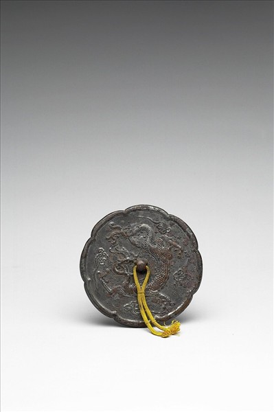 圓鏡,作八瓣葵花形、半球鈕。鏡背飾曲體龍紋,並有四雲朵相隔其間。