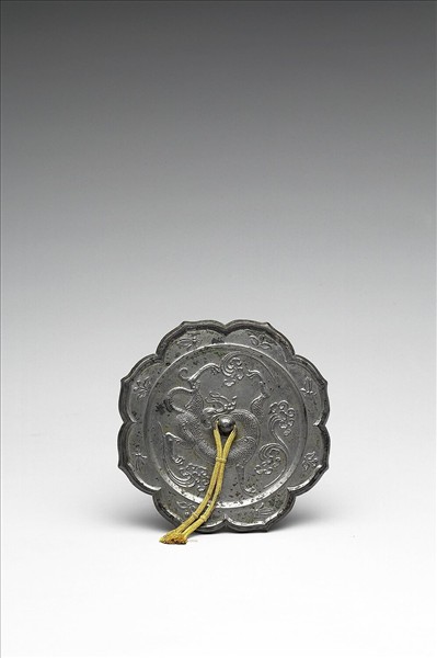 八瓣菱花形鏡,半球鈕。內區飾一浮雕騰龍紋。龍首帶有聳立分叉的雙角,身上滿佈鱗甲。龍身翻轉迴旋,四肢伸展強而有力。龍騰於雲霧間氣勢威武,張口啣住球形鏡鈕,極具戲劇張力。四周環繞朵朵流雲,有飛龍在天之象。外區略高,鏡緣菱瓣內為唐鏡習見之折枝花及蝴蝶紋。 此類雲龍紋鏡曾出土於陝西、浙江、廣東等地唐墓中。約出現於盛唐晚期唐玄宗 開元年間,極盛於中唐時期。