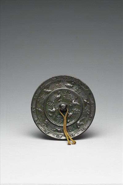 圓形鏡,半球鈕。三紋飾區以弦紋為界,呈同心圓分佈。中心區為四隻禽鳥與花株。第二層為間以花枝的水禽及飛鳥。外緣為一周雲朵紋。紋飾佈局如禽鳥嬉遊於花草叢間,水禽或振翅,或回首,或行走,配以飛翔鵲鳥及小巧雲朵,呈現恬淡宜人的風景。