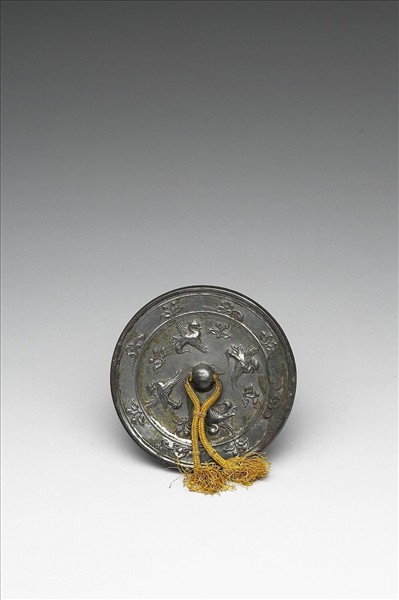 圓鏡,半球鈕。鏡背飾飛鳥四隻與卷枝花卉,鏡緣則以雲紋與花卉間隔排列。