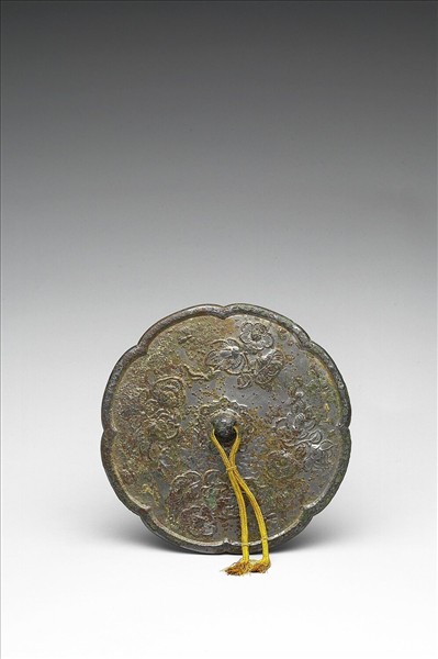 圓鏡,作八瓣葵花形、半球鈕、重瓣花形座。鏡背飾四帶葉卷枝花。