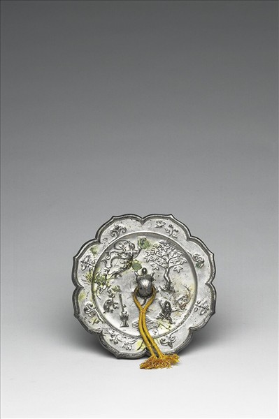 八瓣菱花形鏡,龜形鈕。主紋飾區為月宮場景。桂樹、擣藥玉兔及蟾蜍均極為生動,左上方修長的嫦娥一手持「大吉」方牌,一手持盛桔果盤,凌空飛舞。鏡鈕下方有一水池,池上方有一「水」字銘文。兩旁各有雲紋一朵,更添仙氣。外區略高,飾一周雲朵、花蝶及瑞花紋。 帶有月宮圖的銅鏡廣見於中唐時期,頗有銅鏡清明如滿月、興福降祉之意。五代馮暉墓的墓室天象圖中,也有相似的月宮圖。顯見月宮故事廣受歡迎,同時也是民間信仰的一部份。