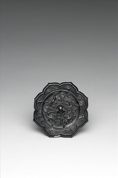 圓鏡,作八瓣菱花形、獸形鈕。鏡背飾二飛鳥與獸,間飾卷雲紋,鏡緣則以蜜蜂花枝與飛鳥間隔排列。