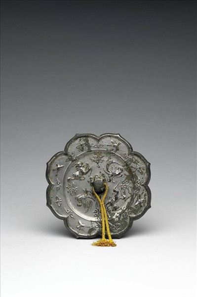 圓鏡,作八瓣菱花形、獸形鈕。鏡背飾二飛鳥與獸,間飾花枝,鏡緣則以蝴蝶、草葉與飛鳥間隔排列。