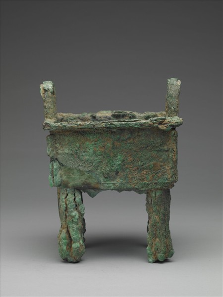 器口呈長方形,折唇,兩立耳,四隅有扉稜,四圓柱足,全器滿被綠色重銹,致使範線不顯,口沿下一道有立羽的獸面紋帶,外底有交叉的帶狀。