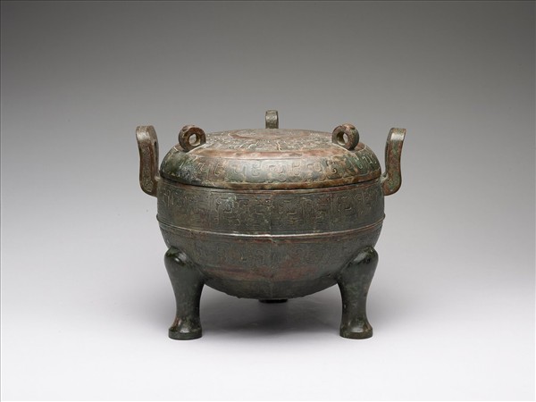 圓鼎,附耳微曲,圓腹,三蹄形足,帶子母口圓頂蓋,蓋上分飾三立環。器腹中央帶一道凸弦紋,上下方各飾蟠螭紋。蓋頂中央飾兩圈圓渦紋,環身飾幾何紋。