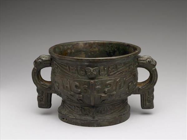圓簋,侈口、雙耳、圓腹、階狀圈足,耳作獸首形附珥。口沿下中央為小獸首,與圈足處飾夔紋,器腹則為兩相對之短尾夔紋所組成的獸面。器內有銘文。