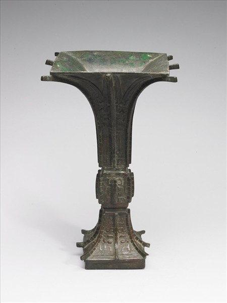 方觚,四方形口、方腹、方圈足,脰、腹、足皆有棱脊。脰、腹、足皆飾獸面紋、雲雷紋為地。足底外有銘二字。