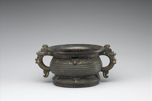 圓簋,盤口、雙耳、圓腹、圈足,耳做獸首形,下有附珥,圈足外有外凸的圈足座。口沿飾回首夔龍,器腹飾橫條紋,圈足飾六個小獸首。獸形耳與紋飾帶局部錯金銀。器內有銘文。