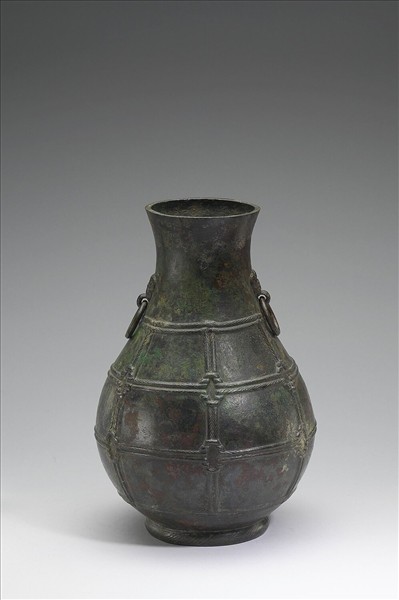 圓壺,敞口、長頸、斜肩、圓腹、階狀圈足,器頸兩側有鋪首銜環。器腹飾圜絡紋,圈足有繩紋。