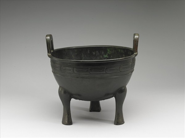 鼎,立耳、折唇、圓腹、蹄足。口沿下飾重環紋。器內壁有銘文三行。