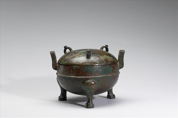 附蓋圓鼎,子母口、立耳、深腹、蹄足,蓋呈半球形,附環鈕。腹飾弦紋一道。蓋有銘二字。