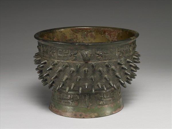 直壁型腹壁曲線,至口緣始外折呈三角形突起,三角兩邊各長0.8公分,圈足甚高,足壁微外張,為通行於商末西周初的銅簋造型。三行滿裝花紋橫列,頸、足各飾雷紋襯底的夔紋,腹飾斜方格乳丁紋,皆為商習用花紋,唯乳丁高凸,約1.8公分,其尖凸有別於殷墟圓渾柔緩,比之商晚陝西岐山山簋者猶有過之,與Freer Gallery藏的西周早期乳丁簋(Freer, No.66)者較近。此器時代因此置於商末周初。