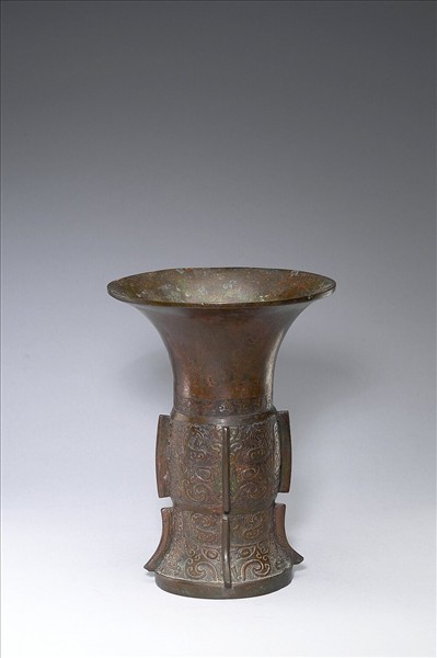 尊,敞口、腹微鼓、圈足,腹、足有棱脊。脰飾四瓣花紋、雲雷紋為地,腹、足皆飾獸面紋、雲雷紋為地。